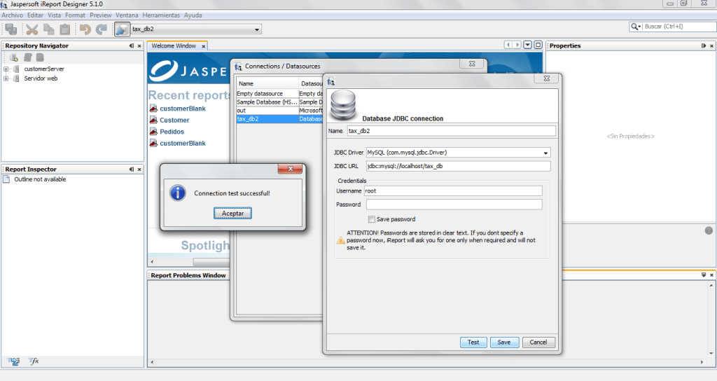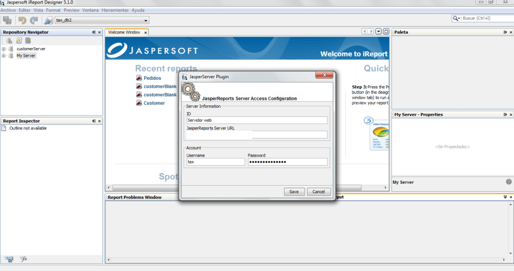Configuramos nuestra conexión con el servidor donde esta alojado nuestro Jaspersoft Server.