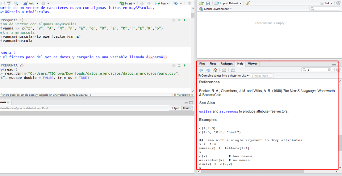 La pestaña que mas he utilizado en la sección enmarcada en rojo, ha sido la de Help, donde se cuenta con documentación básica de las funciones, si bien, en internet por medio de blogs se puede entender a mas profundidad la aplicación de cada función, por medio de esta pestaña se puede acceder de manera rápida a información como el orden de los argumentos que lleva cada función, algunos ejemplos sencillos de cómo se utiliza la misma, etc.