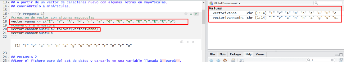 a la izquierda se ve la instrucción de asignar <- un resultado a dos variables una llamada ‘vectorivanna’ y otra ‘vectorivannaminuscula’, inmediatamente despues de ejecutar este bloque de codigo, aparece a la derecha las dos variables.