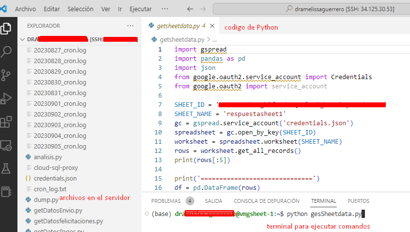 En esta imagen ya nos hemos conectado a nuestra VM a con SSH desde nuestro VS Code, abajo a la derecha esta la terminal, donde podremos enviar comandos de linux para instalar las aplicaciones, a la izquierda el explorador donde podremos subir nuestro codigo de python y en el centro editar nuestro codigo de python